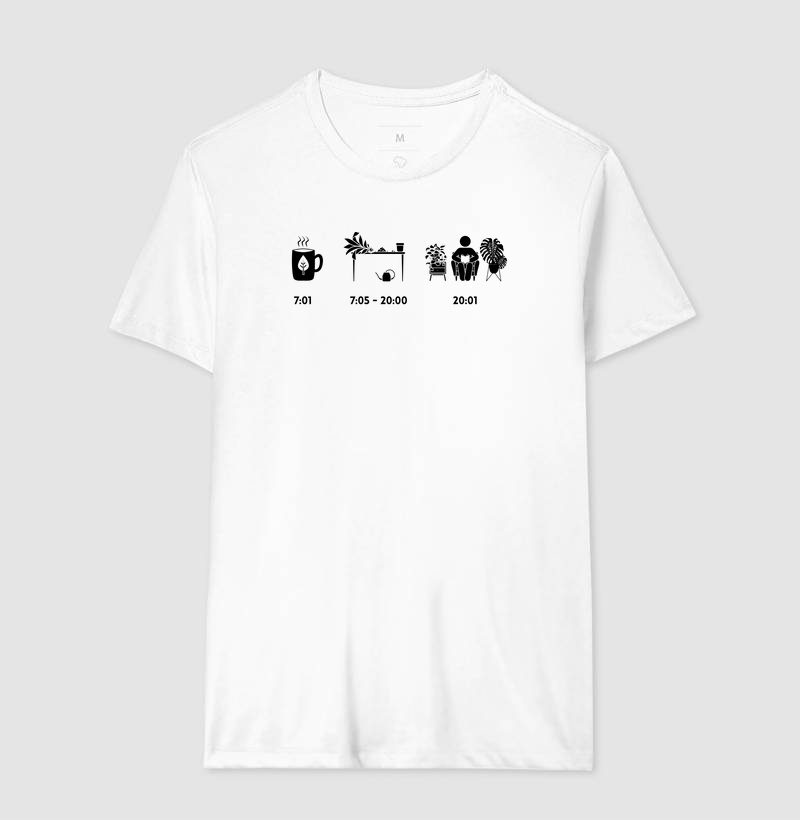 Camiseta Minha Rotina, a estampa ilustra a rotina que todo apaixonado ou colecionador de plantas gostaria de ter. A Camiseta é feita com tecido 100% algodão penteado 30/01, apresentando reforços de costura na gola e nos ombros para garantir uma estrutura sólida e durabilidade prolongada